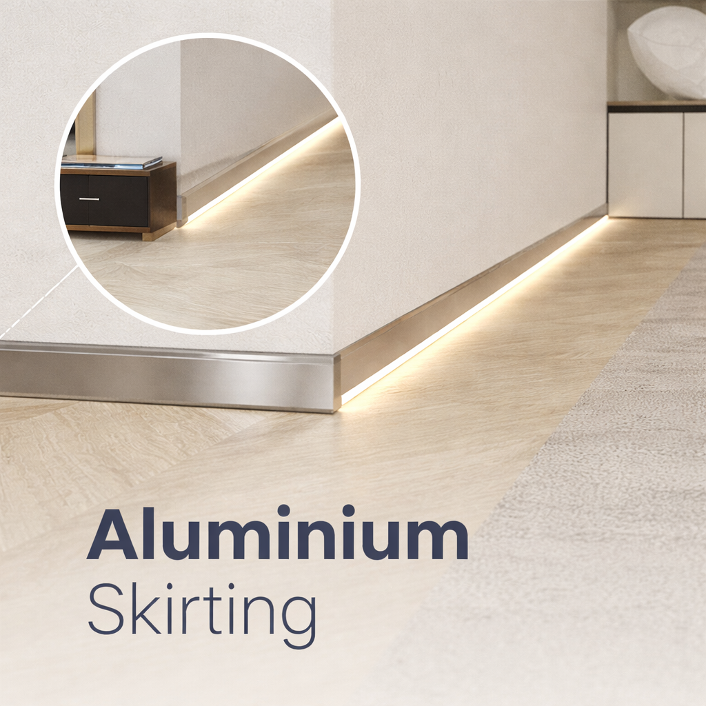 The wall skirting profile provides a modern, sleek alternative to traditional stone or tile skirtings. It improves hygiene and aesthetics by protecting walls from water and dirt, with optional lighting for added functions and style.