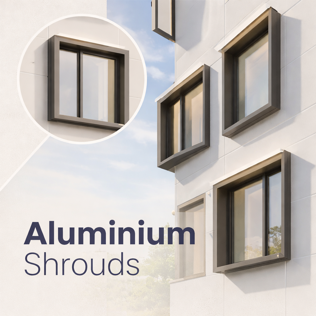 The aluminum shroud system offers effective sun shading, reduces glare and heat gain, enhances privacy, and features perimeter lighting that highlights architecture, combining elegance, efficiency, and modern aesthetics without bulky projections.
